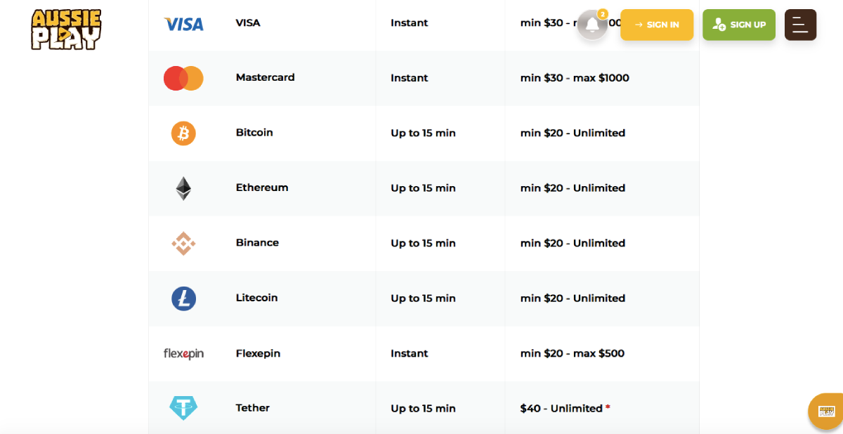 You will be excited to know that Aussie Play Casino does not charge any deposit fees for Visa, MC, BTC, Litecoin, and Flexepin.