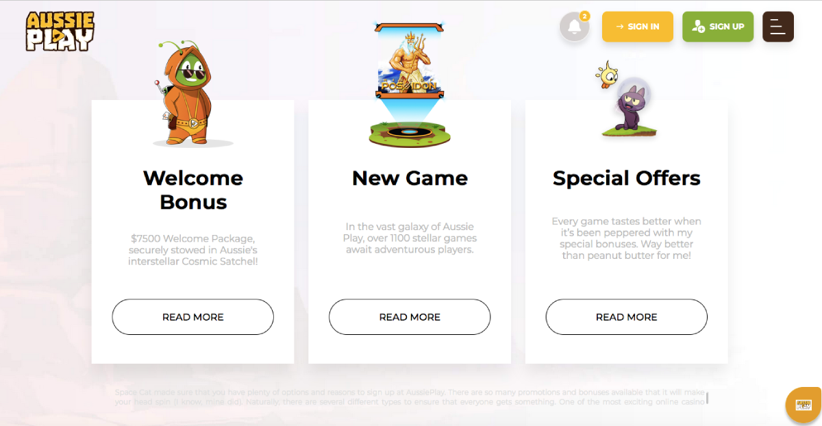 Aussie Play Casino is a lively gaming spot with a space-themed environment to make your gaming experience as much fun as possible. The platform immerses you in a space-like experience with the help of fun characters called Aussie, Zuzu, and Space Cat.