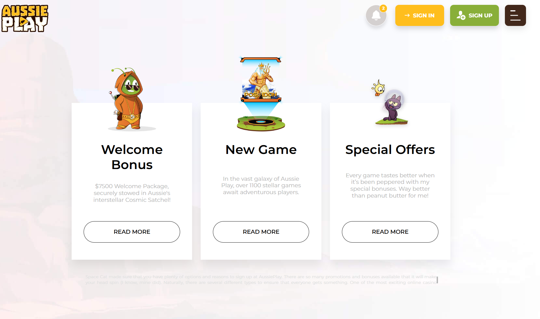 Aussie is an adventurous alien from a planet famous for its casinos. He travels with his companion Zuzu who makes sure that the Aussie Play website is always efficient and mobile-friendly. And Space Cat, who is always cooking up promotions, bonuses, and free spins. They are always there to help you win bonuses and guide you through the platform.