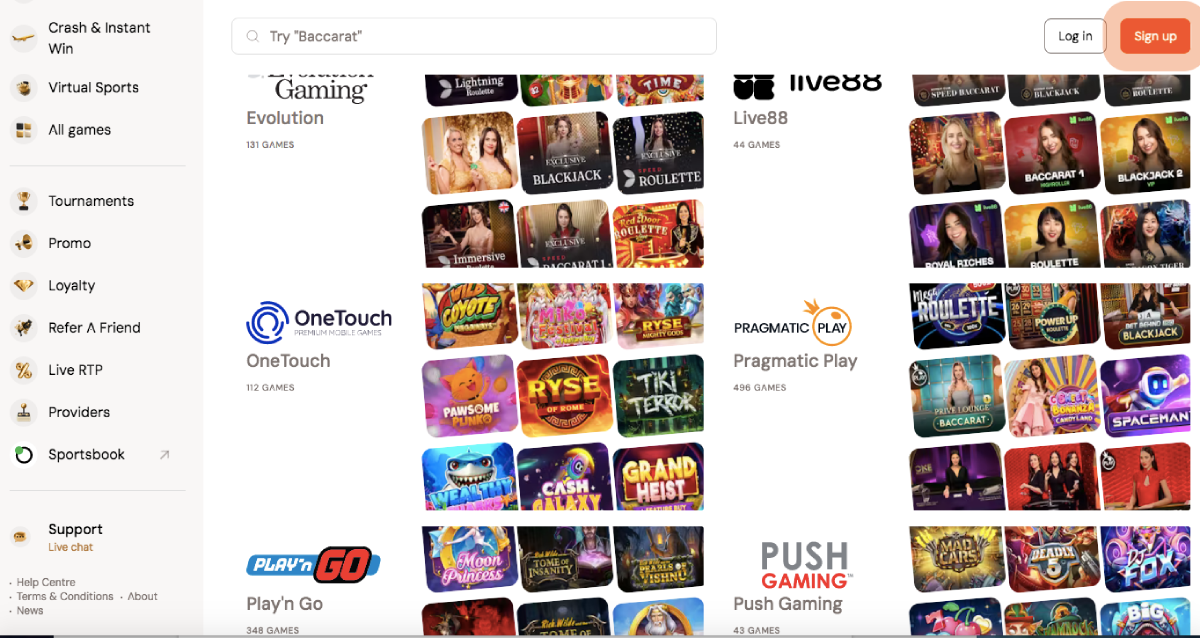 You can enjoy real money games from Caleta Gaming, Kalamba Games, Push Gaming, Spinmatic Entertainment, Tom Horn Gaming, Asia Gaming, Betsoft, Booming Games, Evolution Gaming, and Ezugi. They also have awesome titles from GameArt, Microgaming, OneTouch Games, Realistic Games, and Red Tiger Gaming. Yggdrasil Gaming, Play’n GO, Pocket Games Soft, Wazdan, 1x2Games, NetEnt, and Genii also power this gambling site.