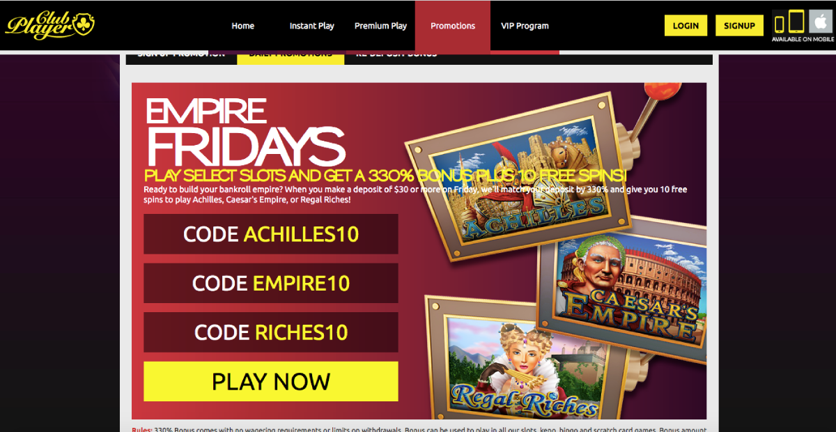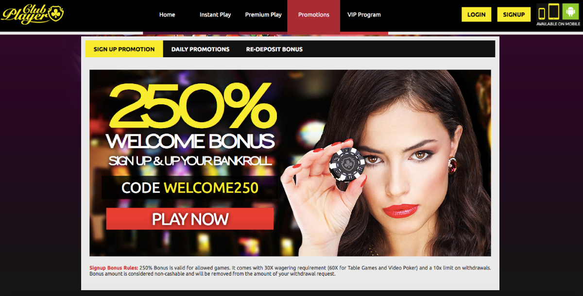 Club Player has a signup offer of 450% when you join. This is a good bonus. But Club Player does not say any more about it. That could be good or bad, depending on what you want.This bonus has a 30x wagering rule for slot games, but it is 60x for table games and video poker.