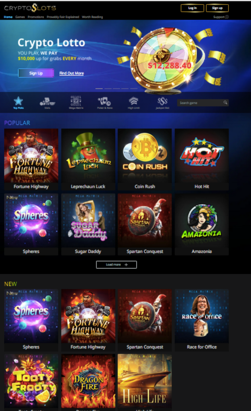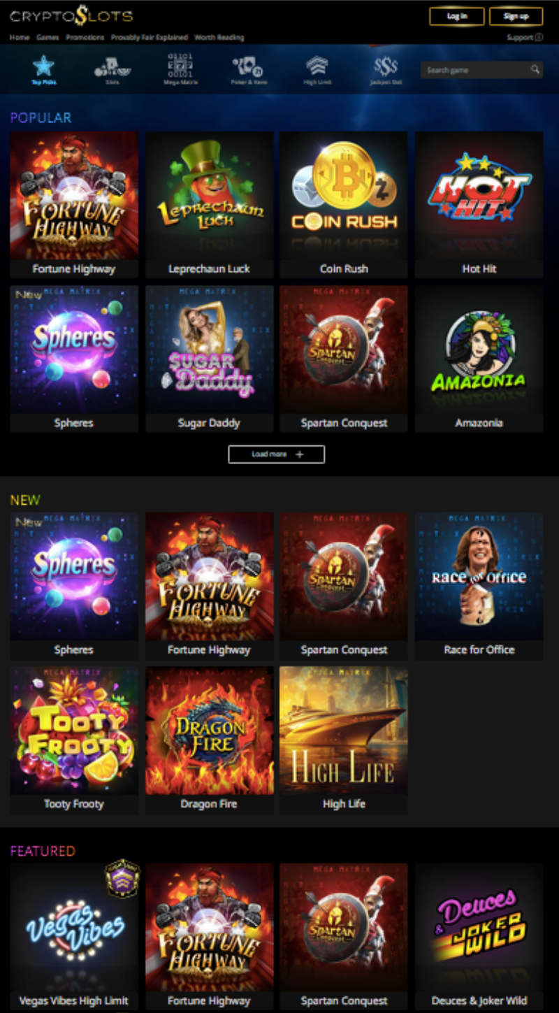 At CryptoSlots, players will find provably fair slots and video poker games with excellent visuals and music.