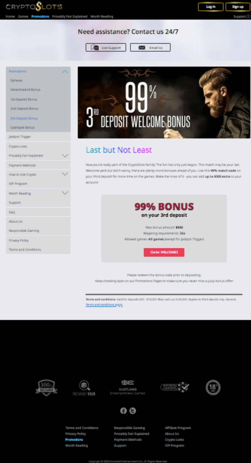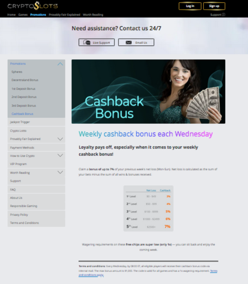 Claim 77% when you make your second deposit,and 99% plus free spins on your third deposit. The Max bonus is $500, plus there wagering requirements are 35x. All games are valid except for Jackpot Trigger. T&C apply. Indeed, there are cashback offers Wednesday . You will find 3% cashback bonus offers.