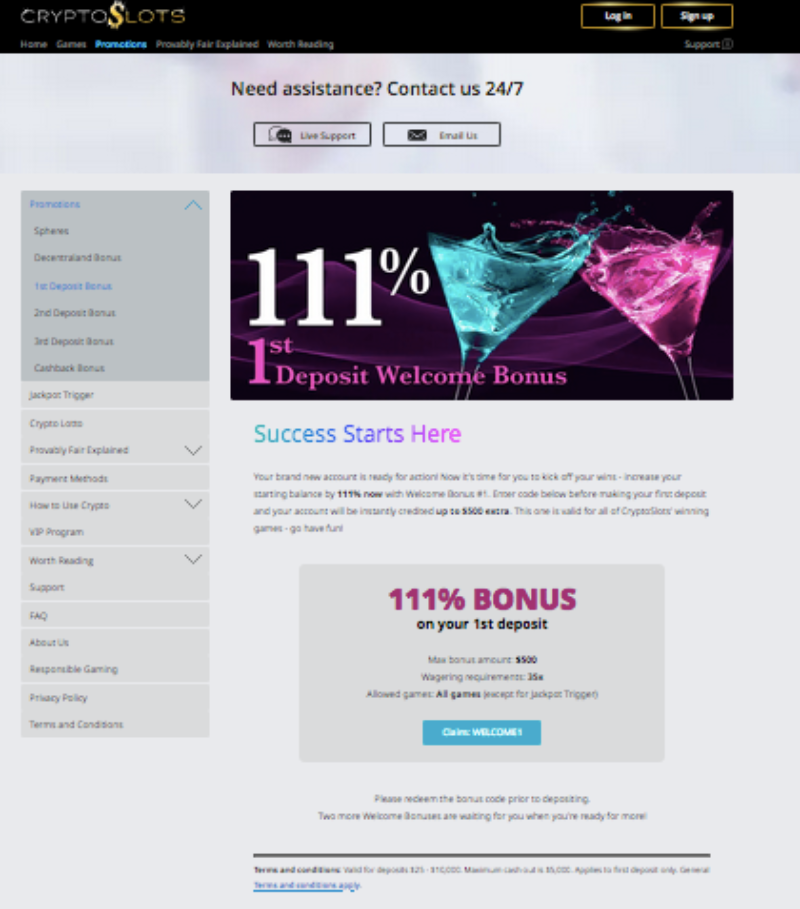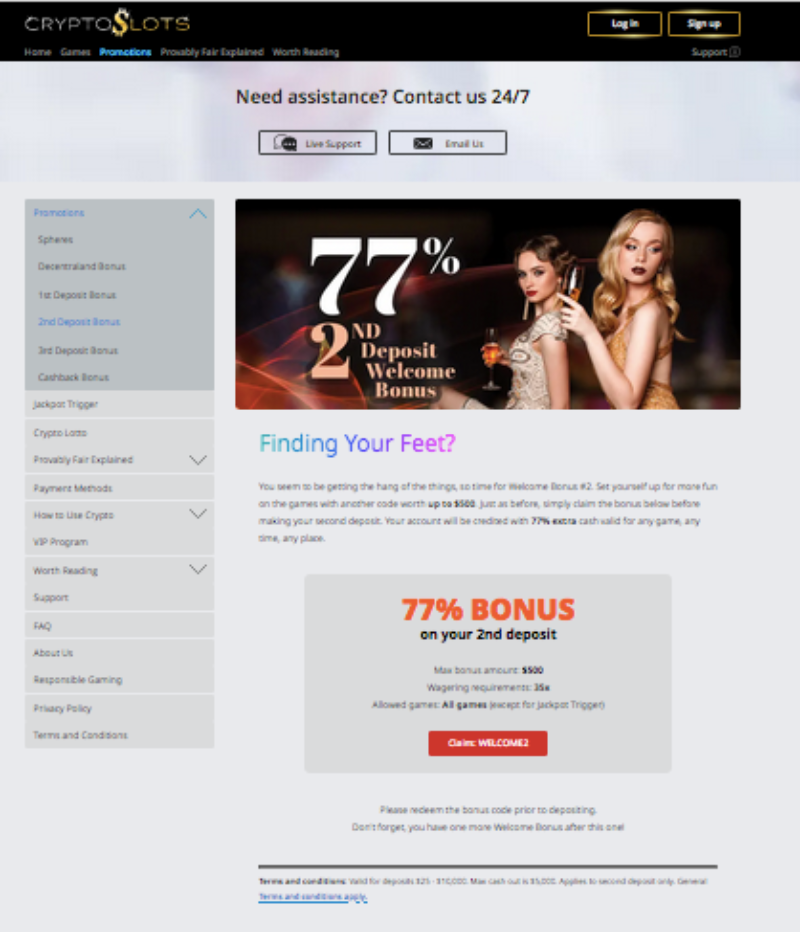 Once you join CryptoSlots, you can get a bonus. If you use the code WELCOME177CENC, then your first deposit will be matched with a 177% Bonus up to $500. Use the code WELCOME2 for your second deposit and you will get a 77% Match up to $500.