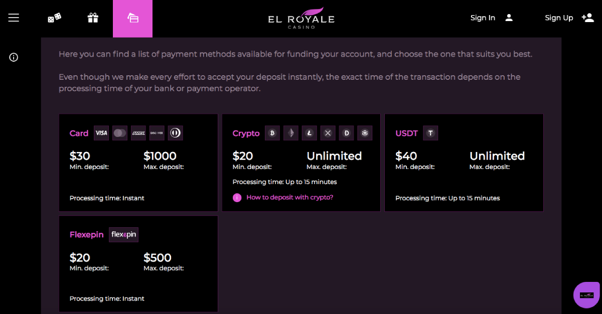 Go to the Cashier section of the El Royale Casino website or in the software client or app, whichever you prefer. Select one of the deposit options from the drop-down menu.Customers can only withdraw from the casino with Visa and MasterCard credit and debit cards that have a minimum deposit of $30.The minimum deposit for Bitcoin, Ethereum and Litecoin is $20.If you want to use Flexepin, there is a $20 minimum deposit. If Neosurf is more your speed, then only a $10 minimum deposit is required.After you enter the required payment information and amount in the provided spaces, click the button to continue to your el royale account.