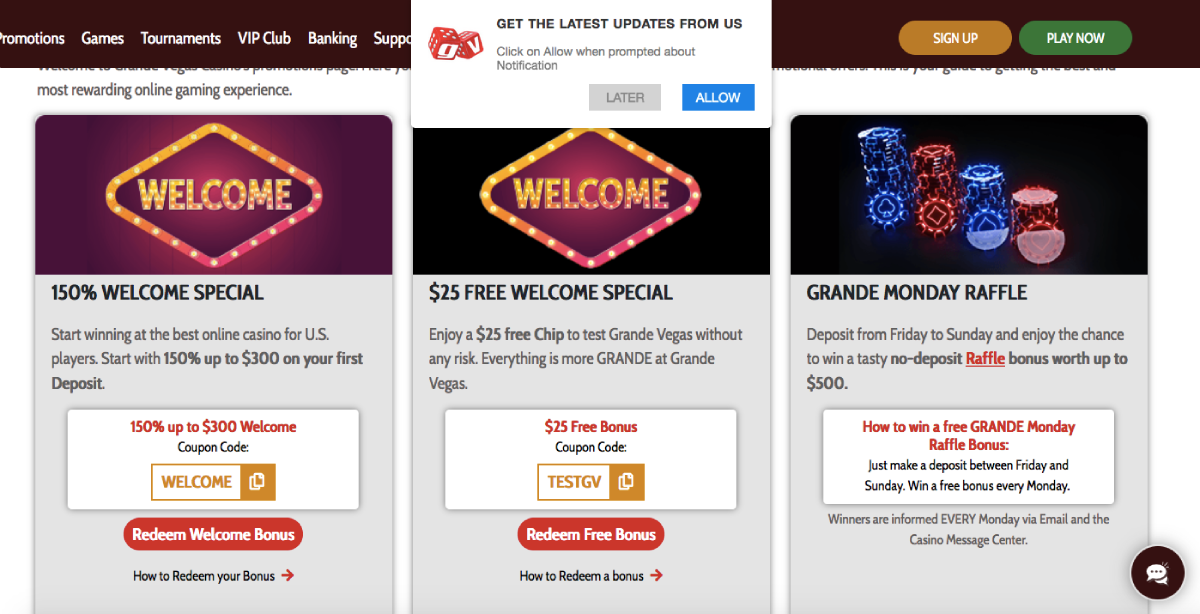 If you’re a US player, you can take advantage of the $50 No Deposit Bonus plus free spins. Also, you may be able to use these for scratch cards. This will let you try out the Grande Vegas Casino experience without having to deposit any of your own money. To claim the free bonus, just follow these steps. (Ask customer support about the minimum deposit)