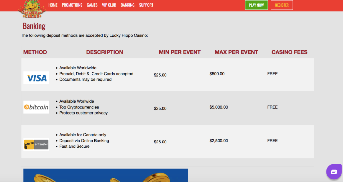 Lucky Hippo offers a few different ways to deposit and withdraw money. All of these methods work for international transactions and US-based players can use them without any restrictions.