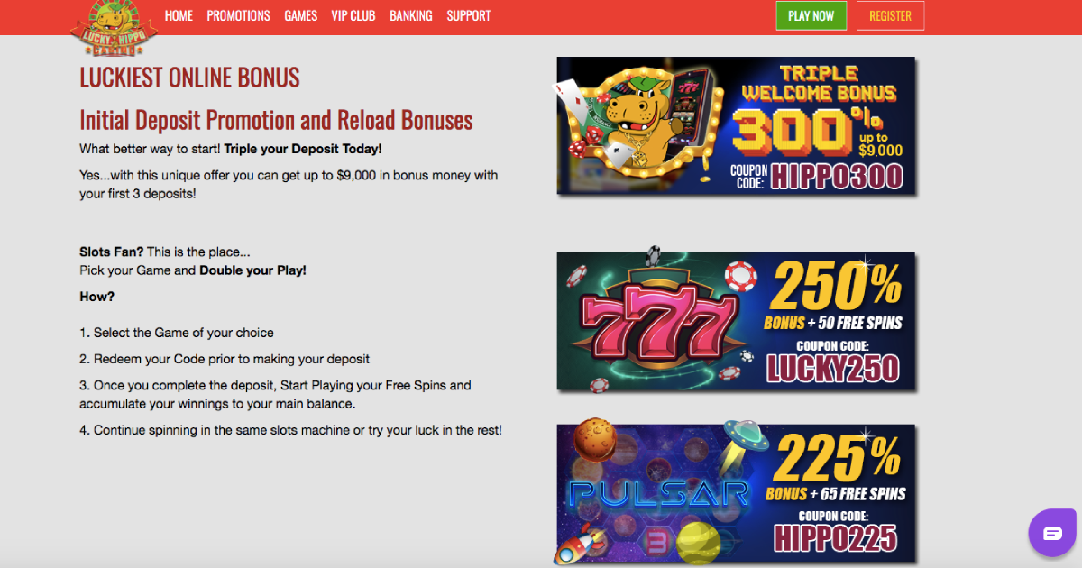 Casinos that offer regular bonuses are good for players. This means that the casino has a long-term plan and wants to keep its players happy. This is a good sign.The Lucky Hippo Casino offers the following bonuses.
