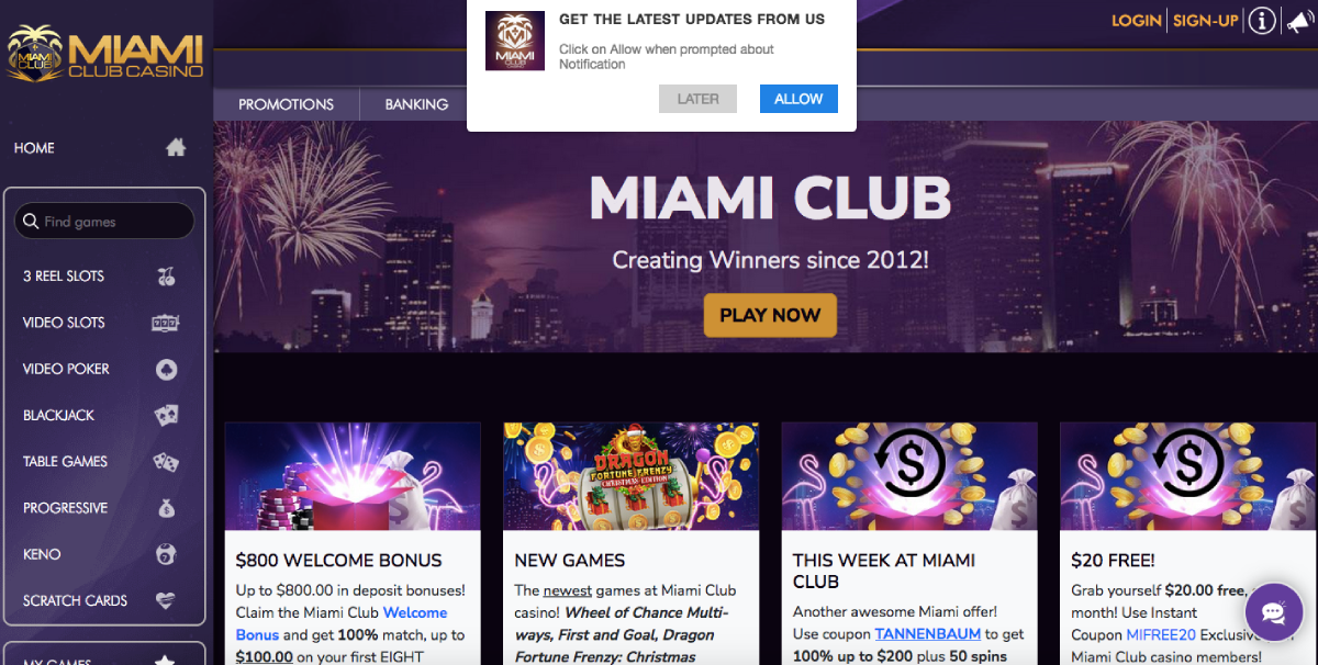 Make sure you use the links on this page when signing up, as that guarantees you’ll get all the bonuses and offers described here and on the Miami Club Casino website.
