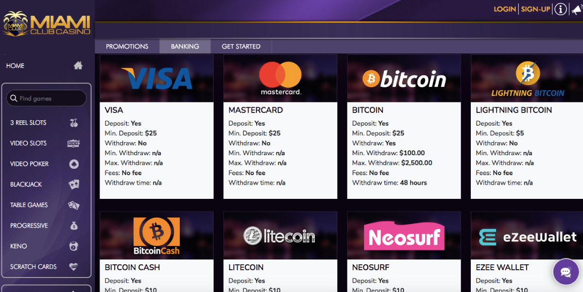 The minimum deposit at Miami Club Casino depends on the payment method you use. BCH and LTC deposits have the lowest minimum of $10, while the two most popular deposit methods, credit cards and Bitcoin, have a minimum of $25.