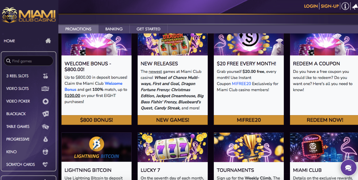 We have an exclusive 25 free spins that you can claim to try out Miami Club Casino. Use our links to register an account and you’ll get the free spins. Using our links will also make sure you can claim the huge $800 welcome deposit bonus, as well as other bonuses.