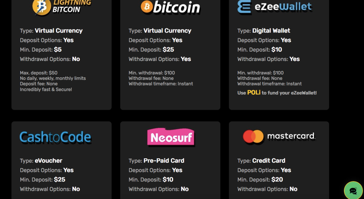 Indeed, this online casino Australia allows players to make deposits several different ways. Players can use Bitcoin, Credit Cards, CashtoCode,Neosurf, and eZeeWallet. When it comes time to cash out your winnings, there are several withdraw options like using Bank wire, eZeeWallet, and Bitcoin.