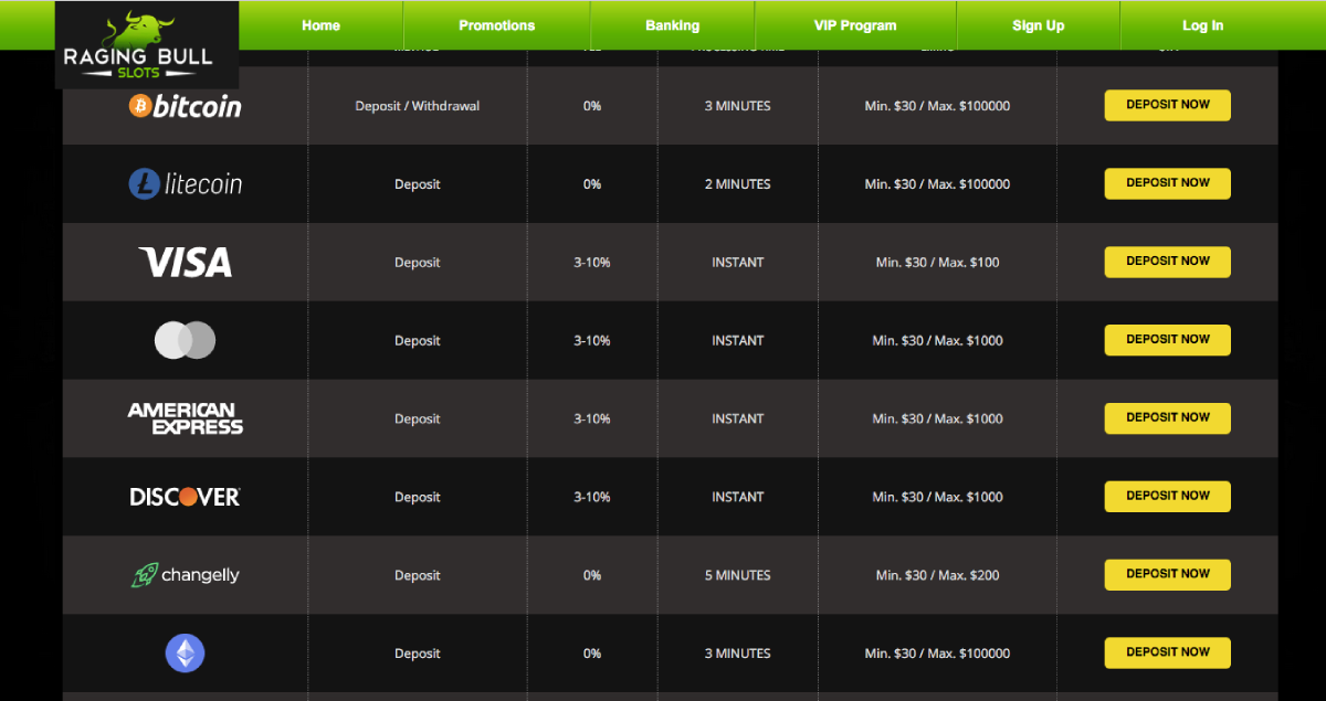 There are a limited number of deposit and withdrawal options at Raging Bull casino, compared to other casinos. However, you can find most of the popular methods there, as well as Bitcoin.This allows anyone to participate in the transactions even if their credit card transactions are not being approved.