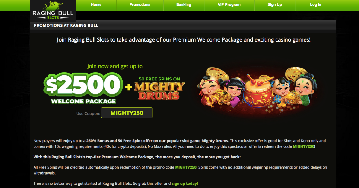 Raging Bull Casino has 10 different types of bonuses. There are three bonuses that give you free spins, three bonuses that give you cash, and five bonuses for when you sign up. We are going to run through all of the different promotions along with their coupons. Keep in mind, while there are several promotions, you can only use one before you make a deposit. You cannot use more than one!