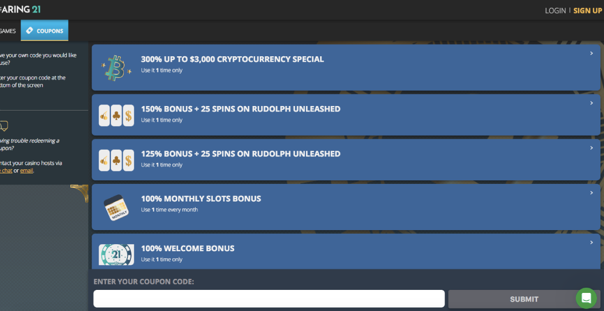 Unfortunately, Roaring 21 casino does not offer any free chips. Furthermore, we don’t have no deposit bonus codes or coupons so you can claim something like 120 free spins or 20,000 free credits. That said, they do have some exclusive welcome bonuses when you sign up through ps4rm.com.