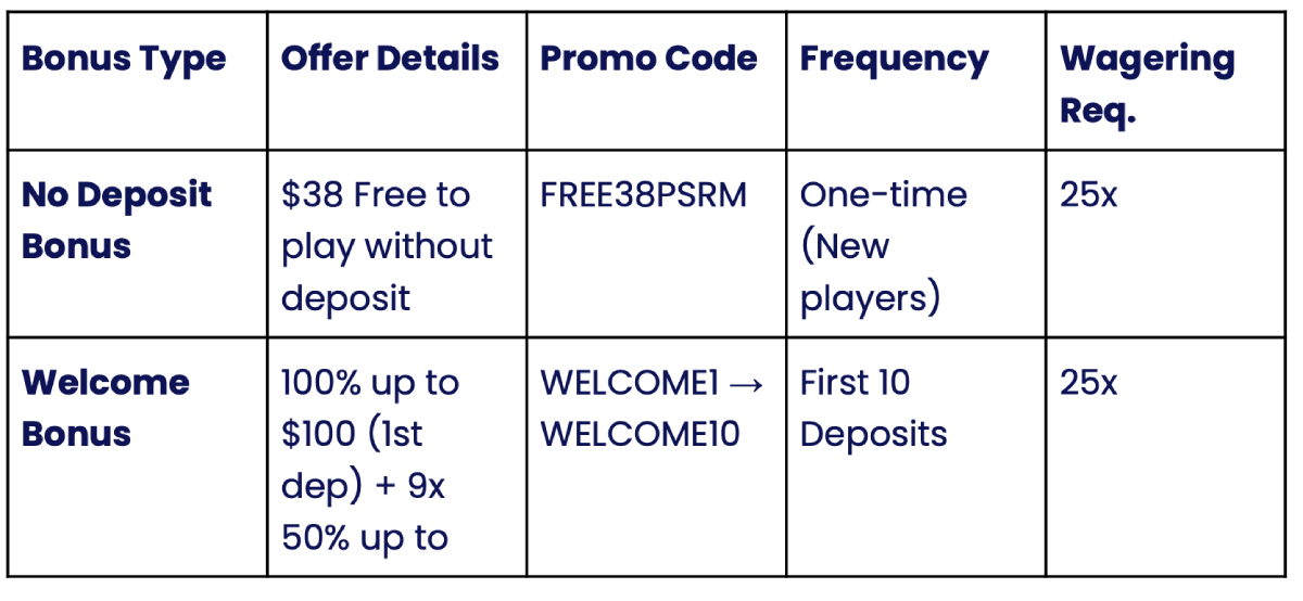 Use Promo Code FREE38PSRM For a $38 No Deposit Bonus Plus Get Your 250% Welcome Bonus up to $1,000 (T&Cs apply).