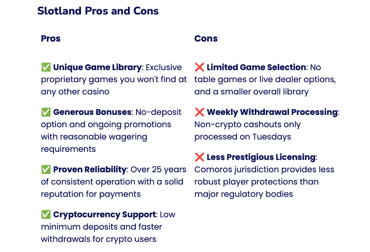 Sure, table game fans will need to look elsewhere, and the once-weekly processing for non-crypto withdrawals is a drag. But for US players seeking reliable payouts and a drama-free gaming experience, Slotland remains a solid choice that’s stood the test of time.