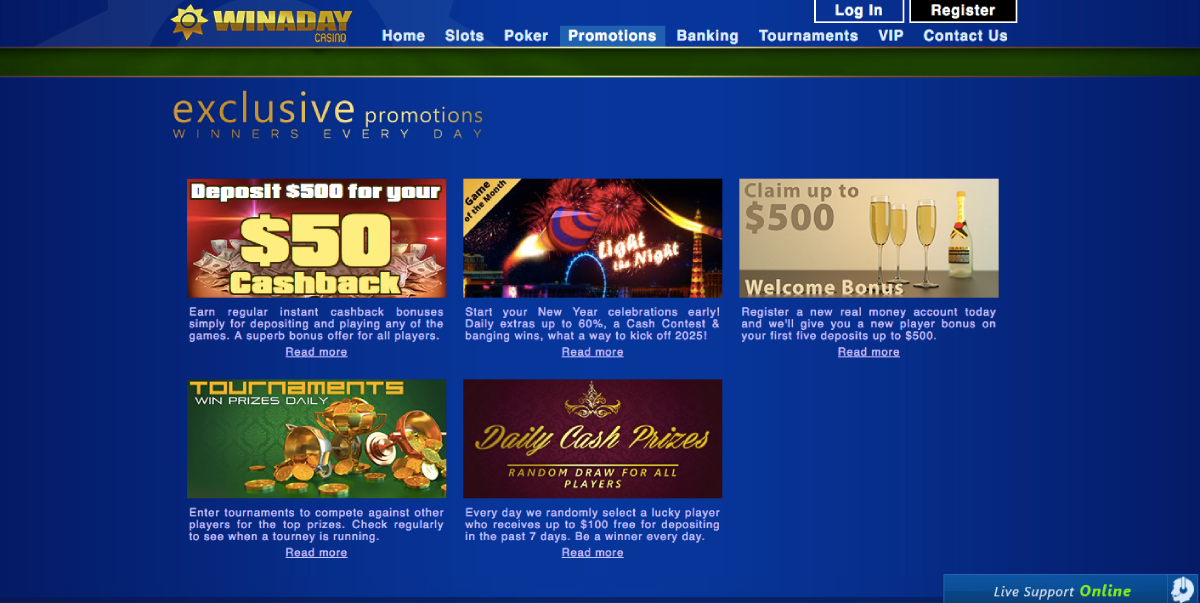 Welcome to our Win A Day Casino review, where we examine in detail everything about this long-standing US-friendly online casino that has been accepting US players since 1998. In this review we’ll see if Win A Day Casino is still great in 2025.
