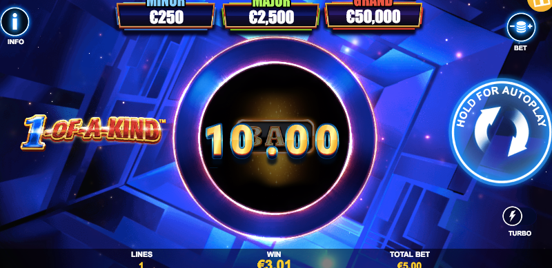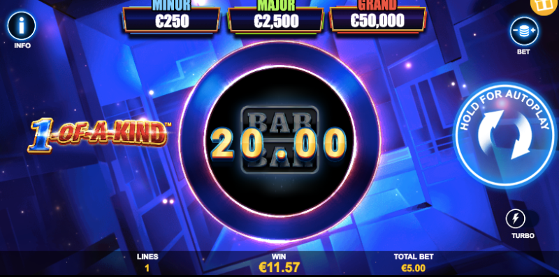 The 1-Of-A-Kind slot game has three levels of Jackpots to win big. To win the top prize, you need to watch out for the Joker symbol and hope it appears while you play. Keep your fingers crossed!To play the Wheel of Fortune game, you need to gather three Joker symbols consecutively in the colors blue, green, and red. If you succeed, you can win the jackpot, which offers Minor – 50x, Major – 500x, or Grand – 10,000x rewards.