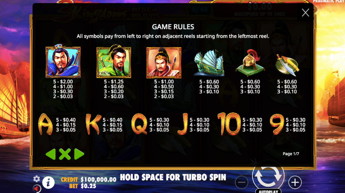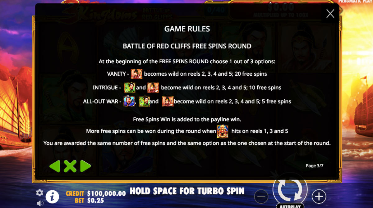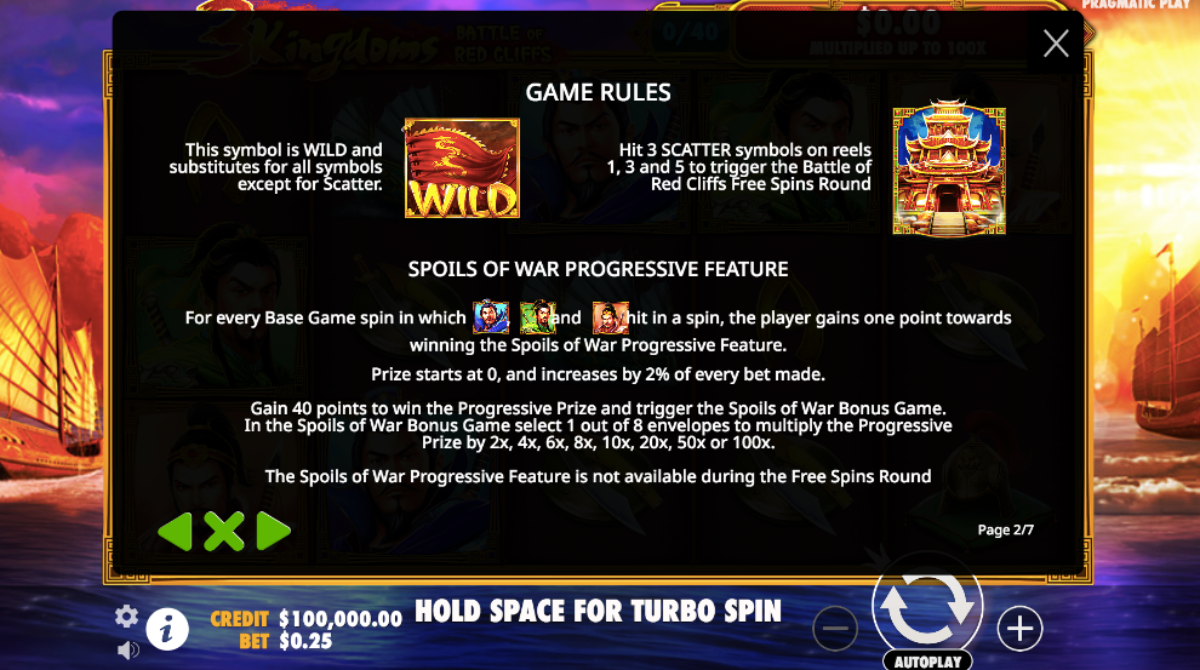 The 3 Kingdoms Battle of Red Cliff’s slot has five reels with twenty-five pay lines. Pragmatic Play powers this Asian-themed video slot. There is a progressive prize, and a Pick Me bonus round that contains 100 X multipliers.