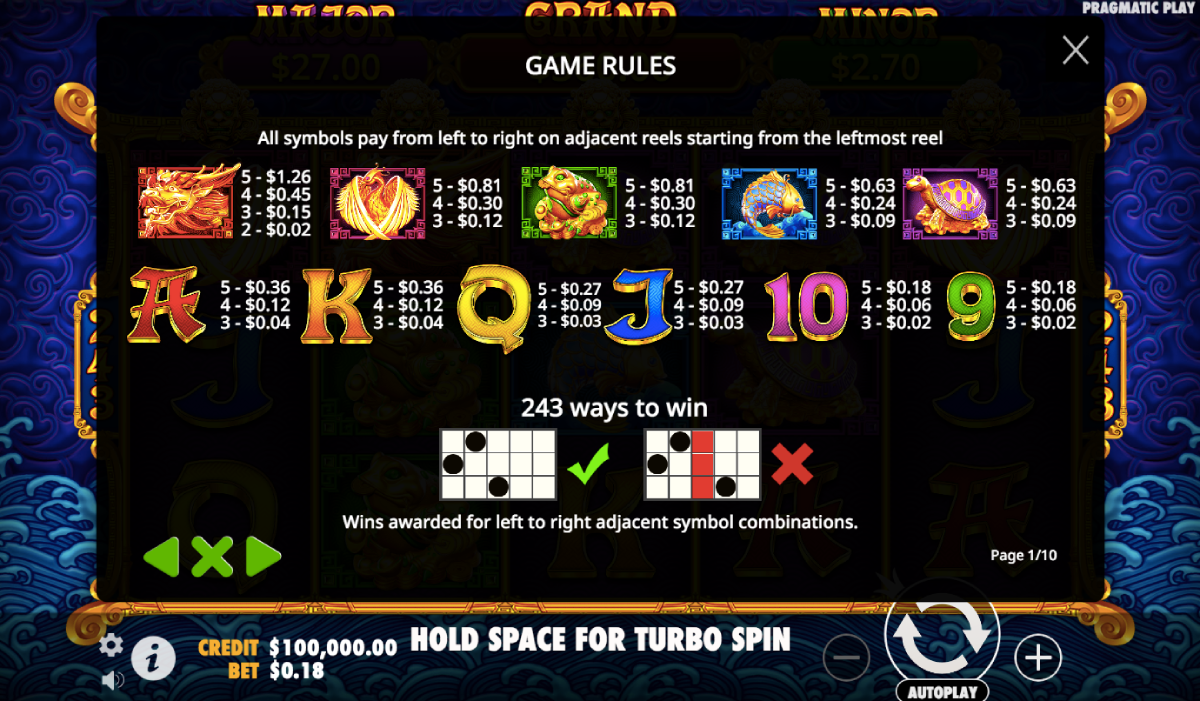 Indeed, the 5 Lions Gold slot machine offers very nice wins plus there are 243 ways to win. According to the official Pragmatic Play website, this title has a 96.5% RTP (return to the player percentage).