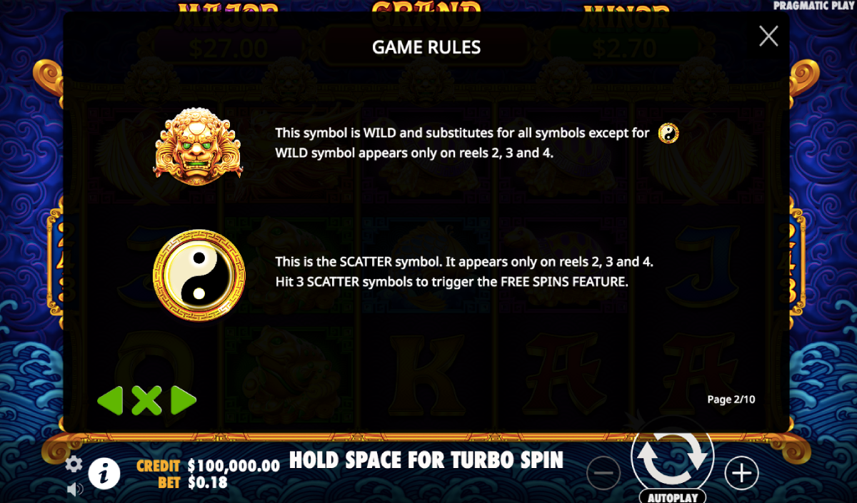 Once you land three or more of the scatter Yin-Yang symbols on the second, third and forth, you will trigger the free spins bonus game.