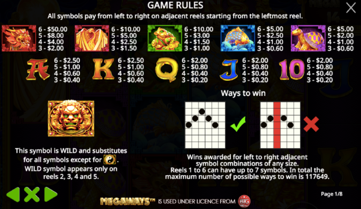 Pragmatic Play copied the images from 5 Lions Gold to make a table. The low pay is 10-A cards and then there are turtles, fish, frogs, phoenixes and dragons which can be worth $2.5-$25 times the bet when they are in a row. One more wild dragon makes its way onto the game board. It lands on one of the reels but does not have any value on its own. It substitutes for all symbols except the Yin & Yang scatter symbol.