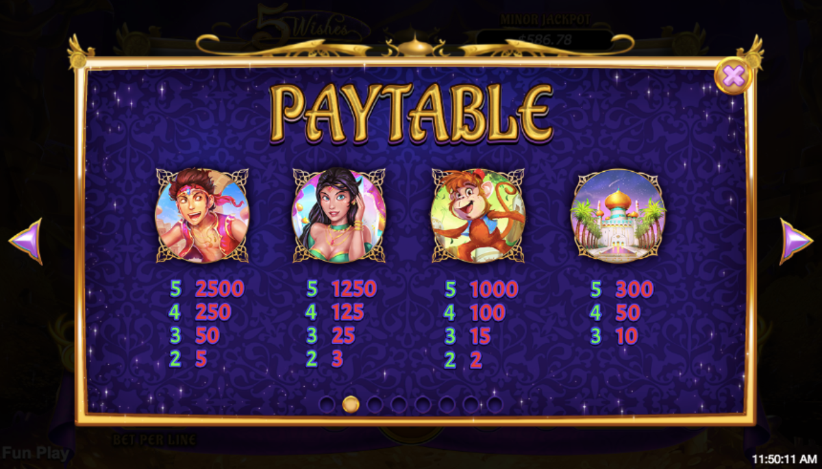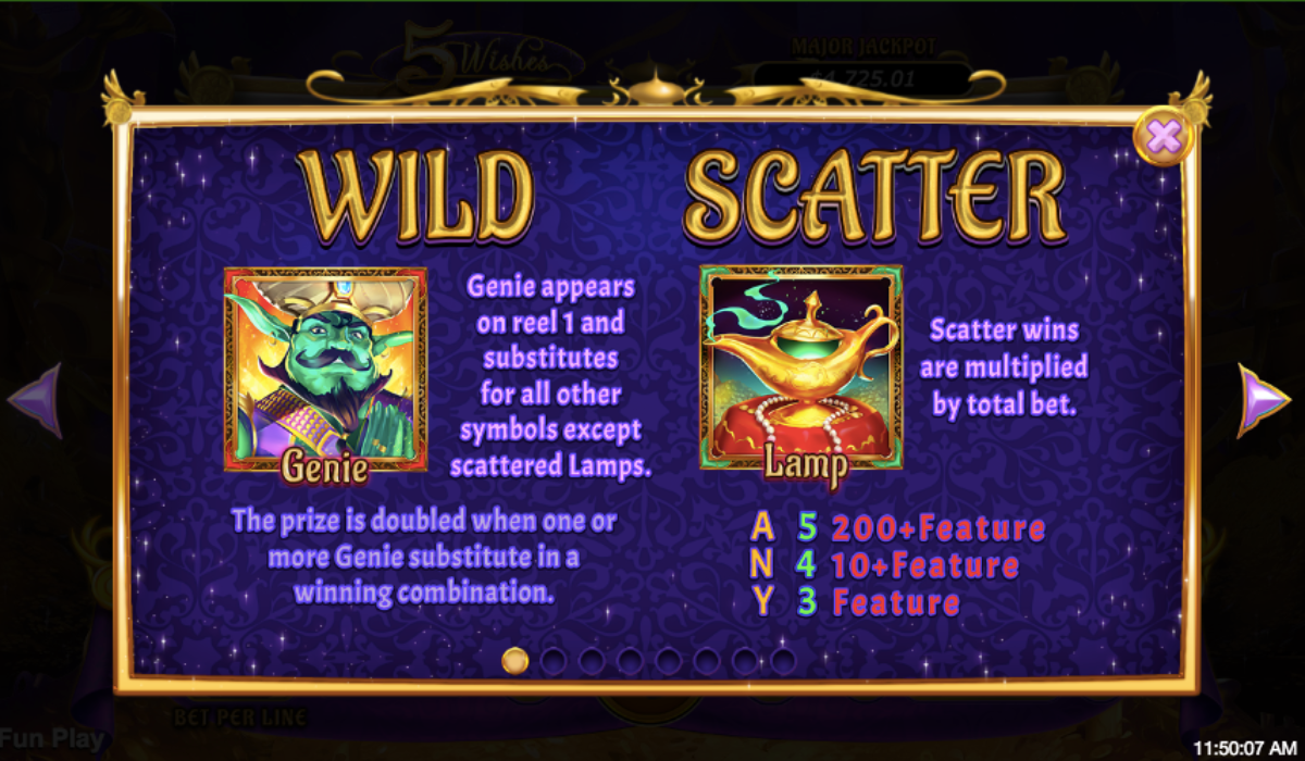 5 Wishes has some interesting and potentially lucrative features. Ultimately, you can feel like you win a jackpot by triggering the multipliers. Keep your eyes open for the Genie symbol as that is the wildcard. When you land the Genie wild, it replaces itself to help you form winning combinations.
