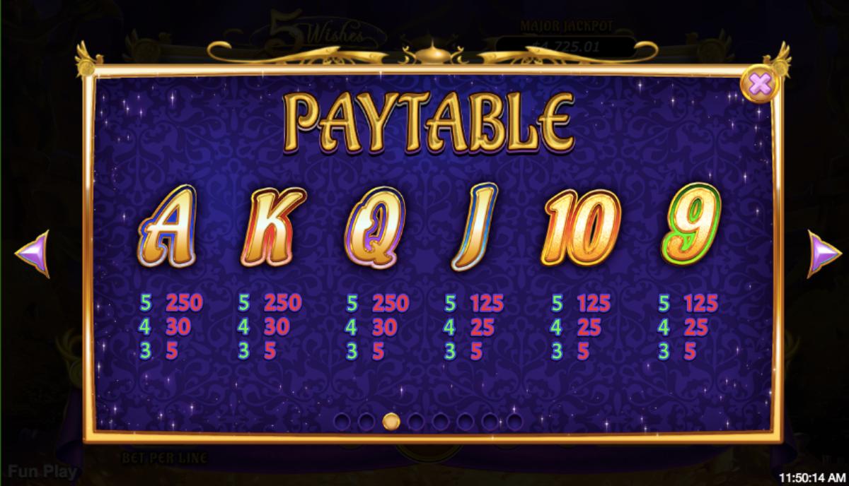 The 5 Wishes slot machine has 5 reels with twenty-five pay line. Furthermore, there are random progressive jackpots you can trigger. If you land scatter symbols, you trigger free spins bonus games. That said, the biggest win, if you don’t trigger the progressive jackpot, is 5,000 times your bet.