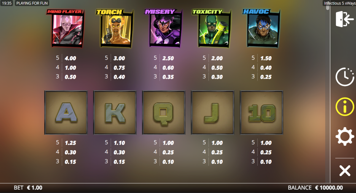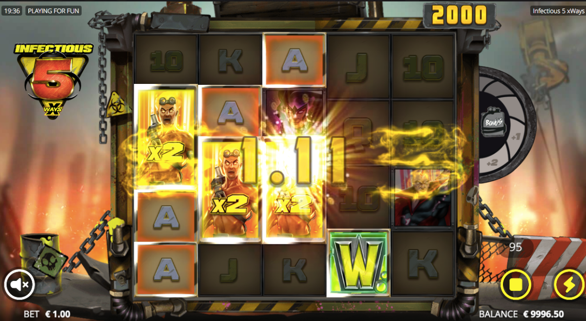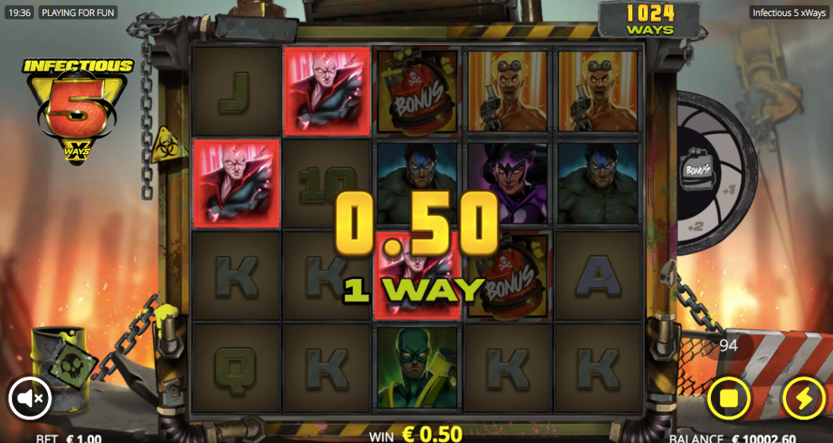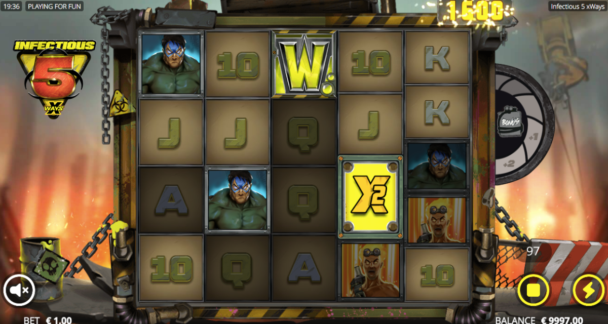 In the game, all of the letters are worth 10 points. The 5 heroes are worth 20 points. You can win more than 100 points with just one letter!The wild symbol is a yellow W and the scatter symbol is a red barrel with Bonus. The xWays symbol plays a big role in this slot. If you land it with the wild, you get extra money. There are some features that only happen when you have xWays symbols: golden Infectious 5 has high value.