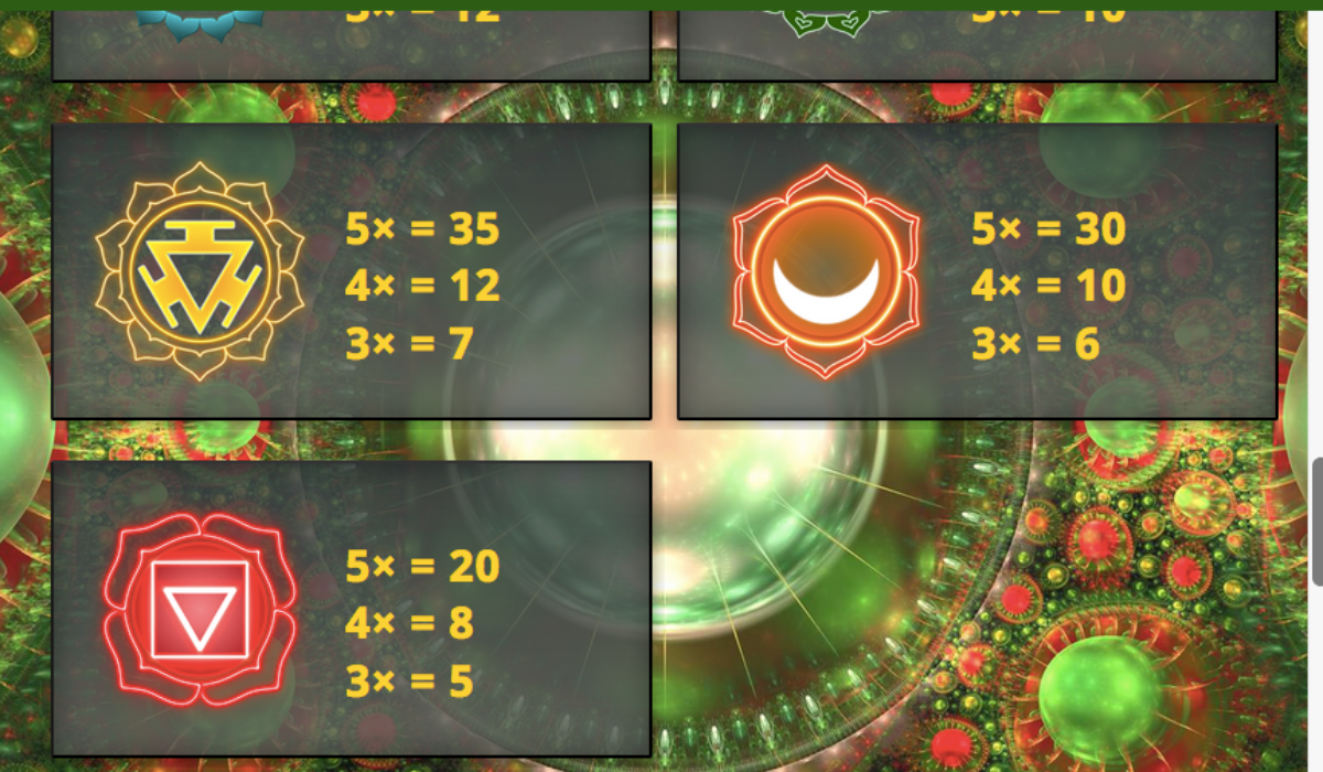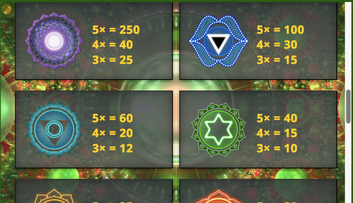 You will find seven symbols on the reels. Each of the seven symbols are allegedly ranked by the importance of each “chakra” that they represent. Furthermore, this starts with the crown chakra symbols and ends with the root chakra symbol.