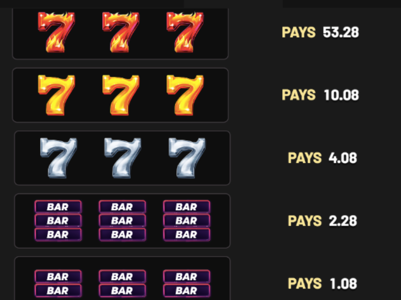 You might think this is easy, but it is hard in practice. That’s because some blank symbols will land on the field too, making wins harder to get. The highest win in the base game is 296x stake for a bunch of fiery sevens. Then they go downhill and the payouts are not so high anymore. If you happen to land a mix of the symbols, you will receive your ante bet back.