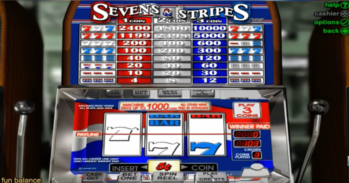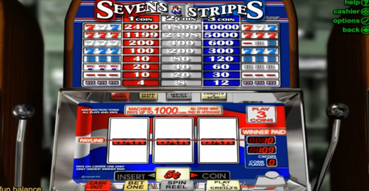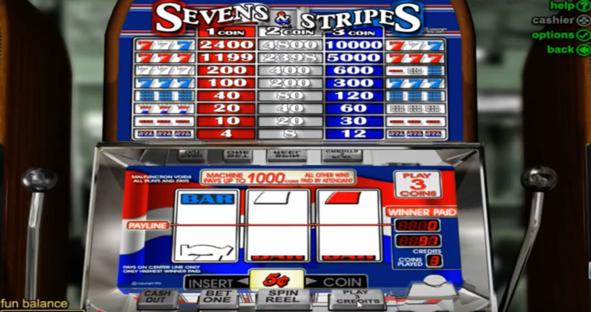 7s and Stripes has a great progressive jackpot and thousands of credits that are up for grabs. 7s and Stripes is a three reel, one pay line video slot machine. The maximum bet is fifteen dollars.