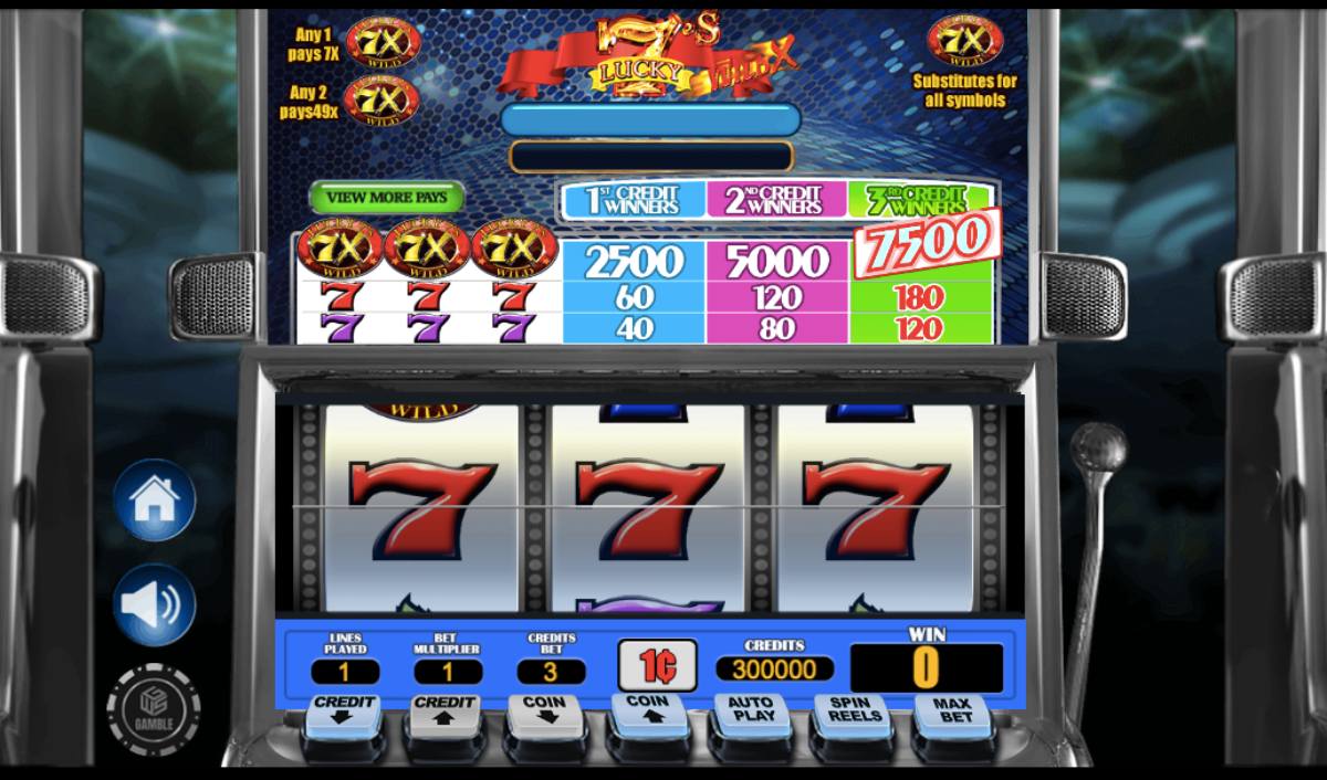 The gamble feature can bring you some nice wins. Most people look for games that have a progressive jackpot or a gamble feature. 7X Lucky Sevens has both! Start betting one penny per spin. Increase and decrease your bets by clicking the credit up or the credit down button.