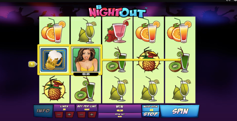 Playtech’s A Night Out slot game has a cartoon-like design with 5 reels and 10 paylines. The symbols used in the game are reminiscent of a nightclub on a Friday night and include a kiwi fruit, orange, pineapple, strawberry, and pear.