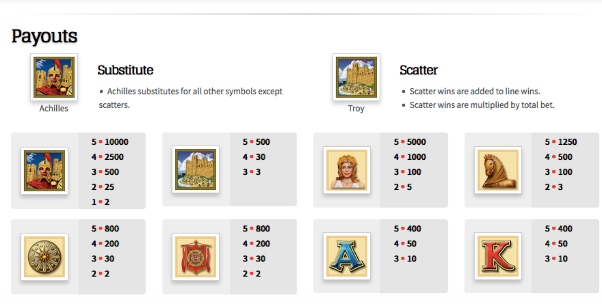 Achilles is the wild symbol. He will substitute for all symbols. The only icon he will not replace is the scatter. Land the Achilles wild symbols, and it will complete a winning combination payout.