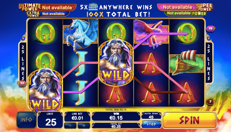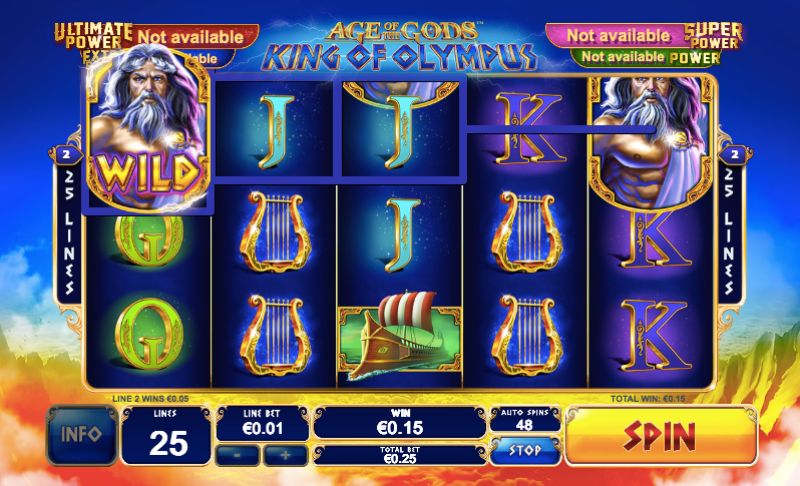 Age of Gods: King of Olympus has 25 fixed paylines across its five reels, ensuring that you will always have a clear understanding of your position while playing against the king of the gods.