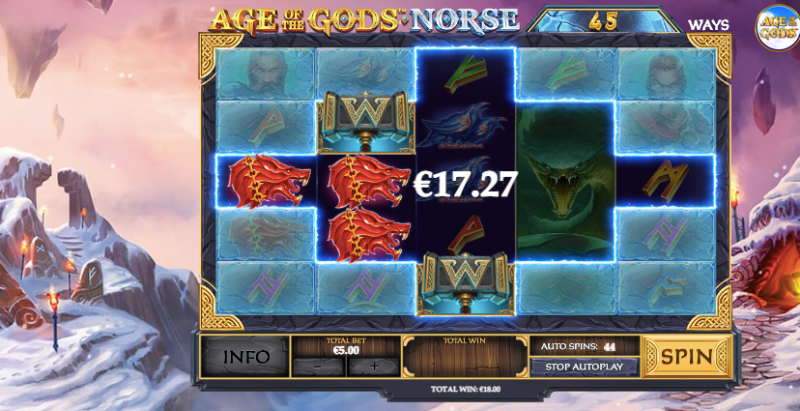 The slot game “Age of the Gods Norse: Ways of Thunder” has 5 reels and 4 rows. Initially, there are only 45 ways to win due to the presence of frozen symbol positions. However, with each consecutive win, more symbol positions become available, increasing the number of ways to win up to 3,125. You can achieve a win by getting 3 or more matching symbols in a row on the reels.