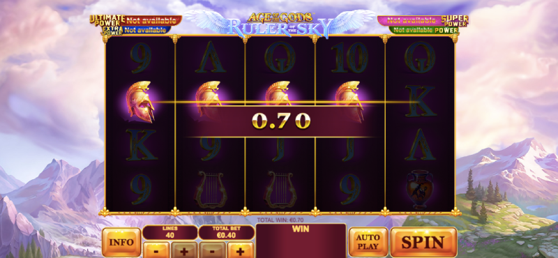 The game called “Age of the Gods: Ruler of the Sky” has five reels and 40 paylines. Pegasus is the wild symbol and can appear stacked on any reel. It can substitute for all symbols except for the scatter. Pegasus pays 1,000 coins for five appearances, 200 for four, and 50 for three.