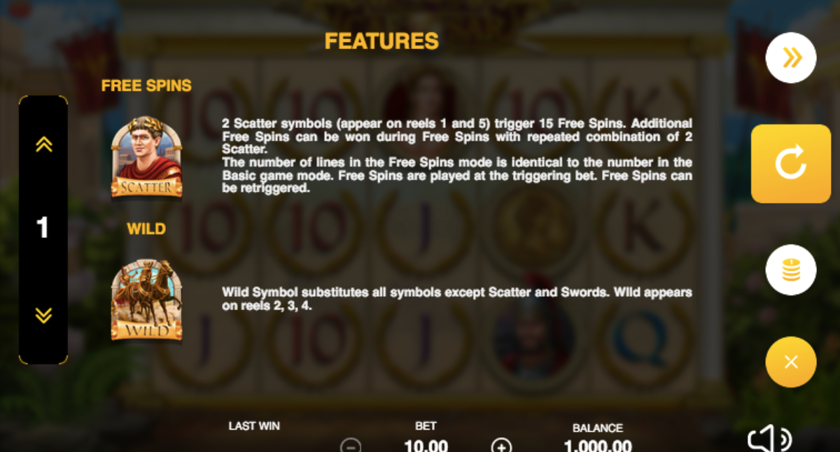 Gameplay starts with an avenue of ancient Roman buildings surrounding a principle pillar. This pillar presents the 5×3 matrix of Imperial Reels at the center of screen. Playing cards from 10 to Ace are ringed in laurel wreaths. They are accompanied by a small collection of Roman characters that prove to be high-paying symbols. The game’s graphics are impressive in their presentation. Yet, they do not offer all that much originality from similar themed games.