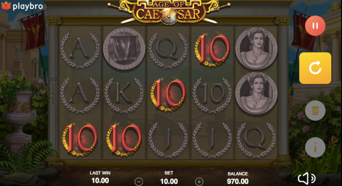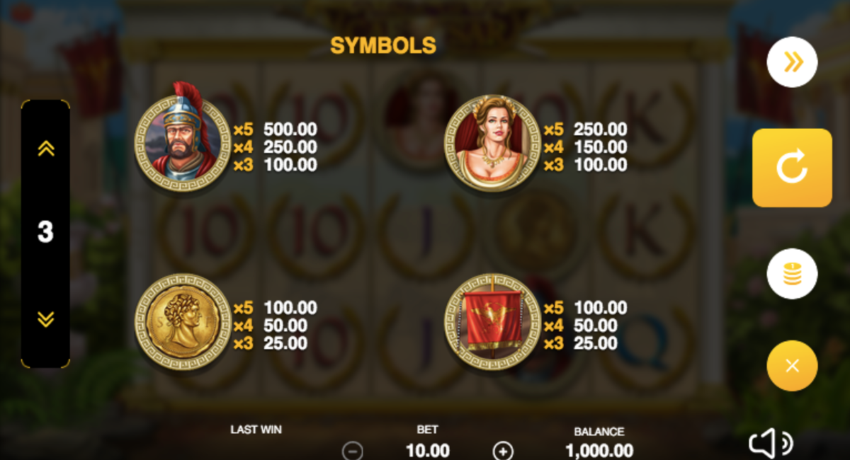 The game does offer a range of fixed bets in graduated amounts. With higher stakes than most average real money slots, Age of Caesar will appeal to high-limit players. There is also a free-play version with lower betting stakes and a 1,000 initial credit.
