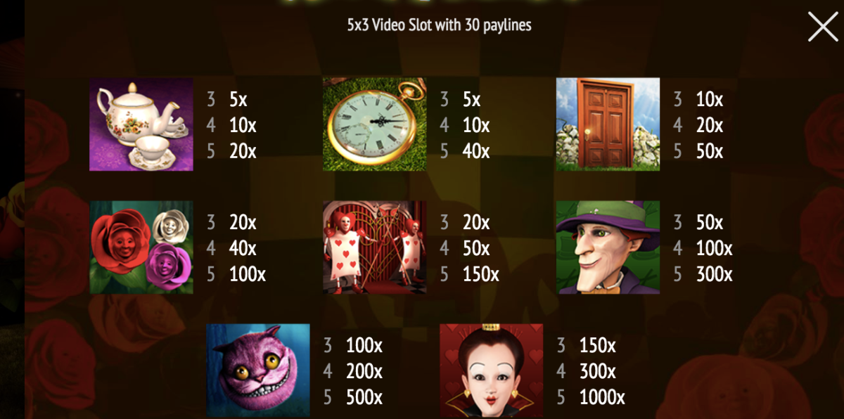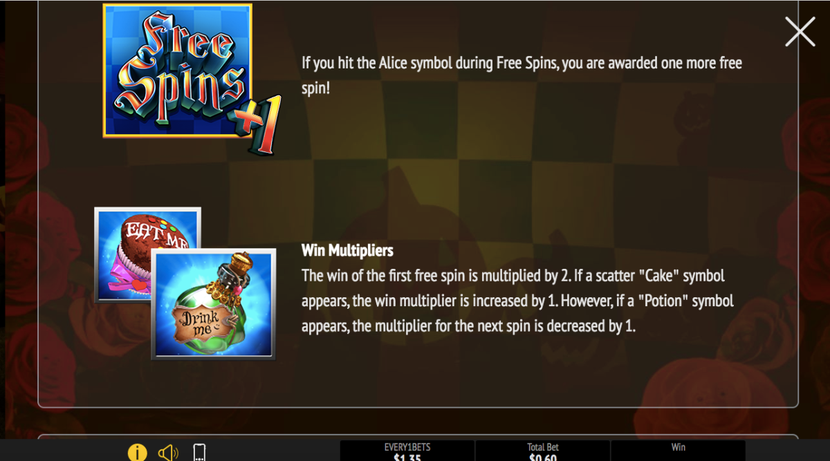Whenever Alice appears on at least three reels, the free spins bonus feature activates. This feature can reward you with up to 15 free spins each time it is triggered. You should look out for the potion and cake symbols as well since these two will either increase or decrease your current win multiplier.
