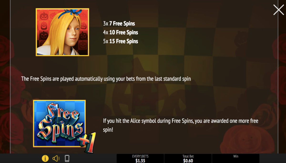 Alice in Halloweenland allows players to play for as little as $0.60 to as much as $30 each spin. With its 30 active paylines and bonus features, you are likely to get some nice Halloween treats. As you spin the reels, you will encounter potions, the Cheshire Cat, teapots, roses, the Mad Hatter, the Queen of Hearts, and Alice herself.
