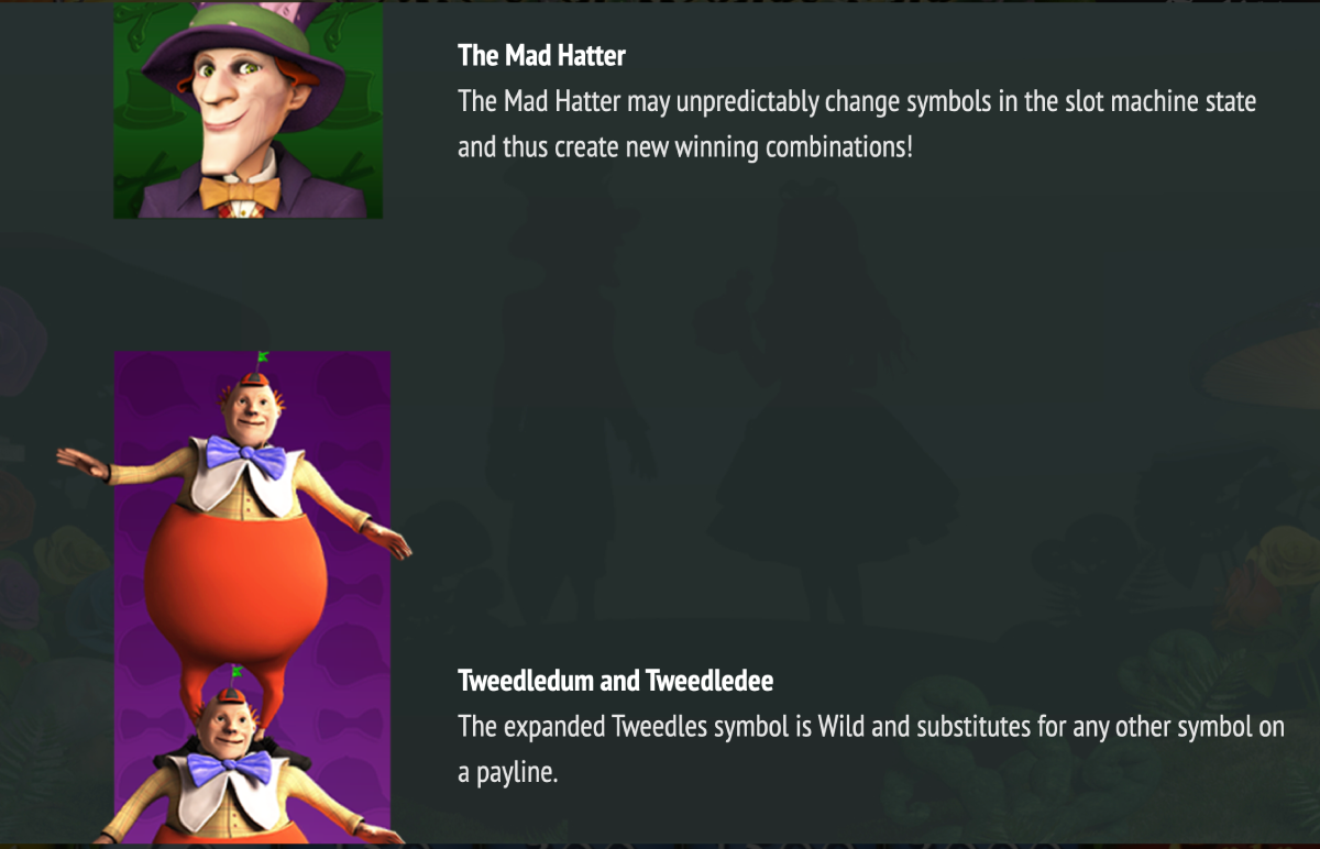 Keep your eyes peeled for the Tweedledum and Tweedledee symbols, as that is the wild icon. When you land a Tweedledum and Tweedledee wild symbol it will make the entire reel wild.