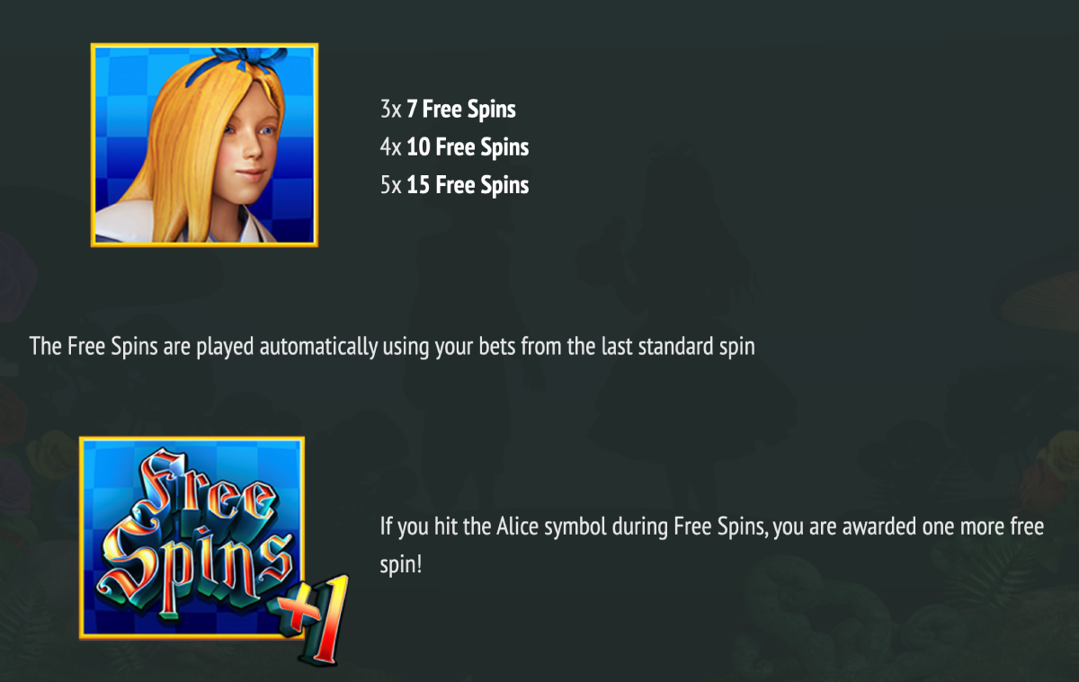 All you need to do is land anywhere from three, four and five of the Alice symbols on the reels and you will win up to fifteen free spins!