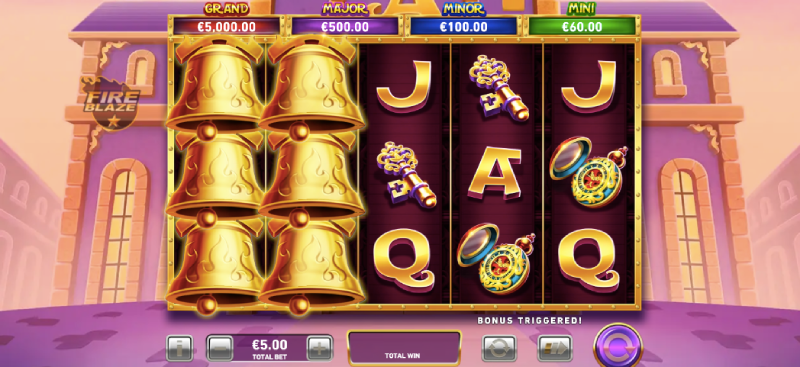 The feature is called “Bell Bonus” and to activate it, you must collect six or more bell symbols. This will trigger three re-spins during which the bells will become coins with labels: Mini, Minor, or Major. The coins will remain locked in place for the entire round. If you collect more bells, you can win the prizes indicated on the coins or collect enough to fill the screen and win the grand prize.