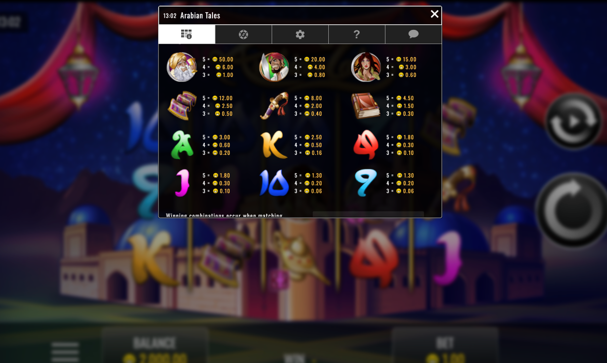Arabian Tales is a five reel, fifty-pay line video slot machine that is powered by Rival Gaming. When you start to spin the wheels and play Arabian Tales you can start to bet as little as one penny and up to twenty-five cents per pay line. The maximum amount that you can bet on each pay line is ten coins, which makes that maximum amount of money that you can play Arabian Tales with is one hundred twenty-five dollars.