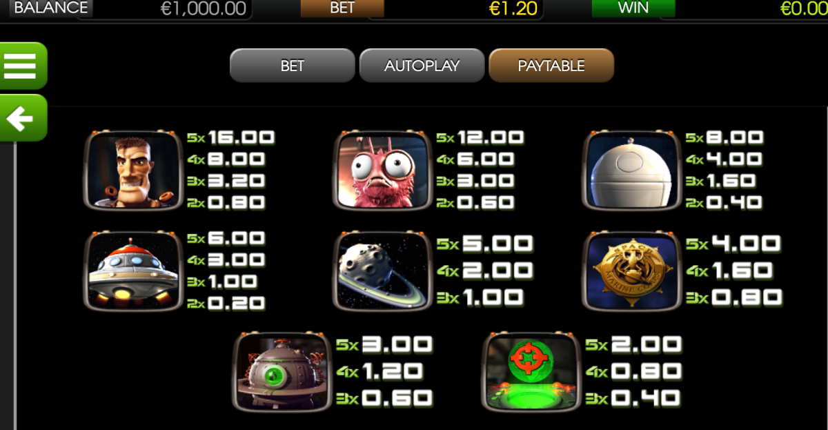 The minimum coin size that you can bet is two cents, and the maximum coin size is one coin. You can bet as little as one coin per pay-line and as much as five cents on all of the thirty pay lines when playing this intergalactic video slot machine game.