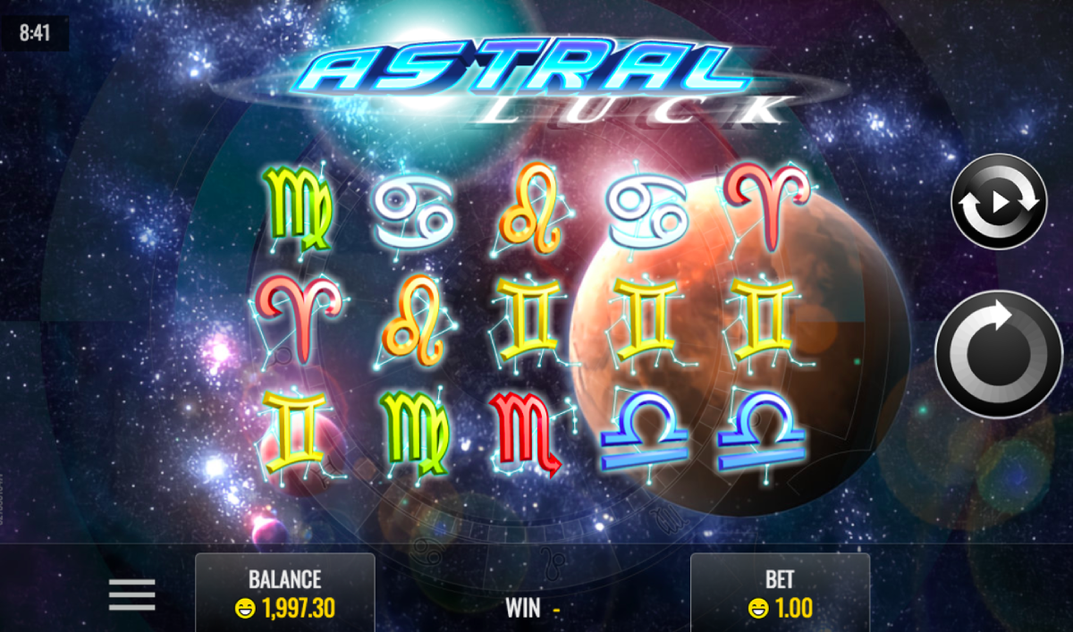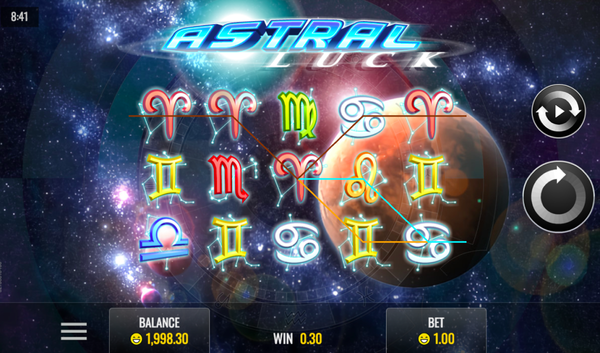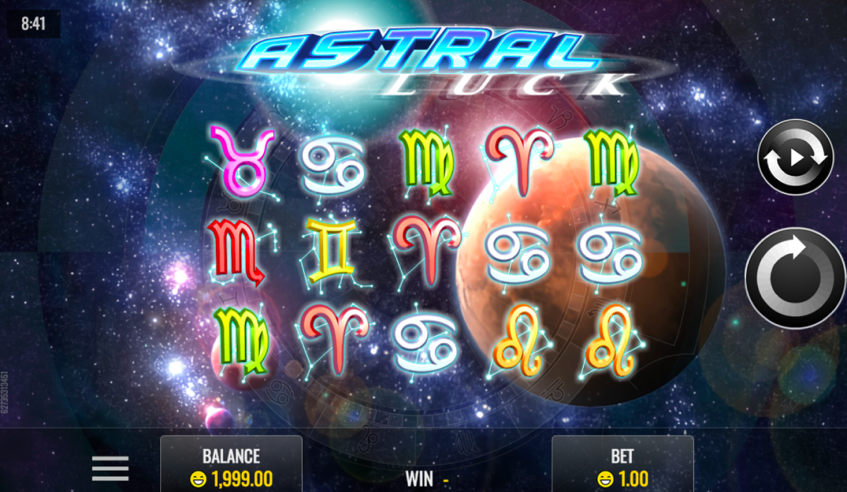 The Astral Luck slot machine game features five reels with fifty pay lines. Rival software powers this video slot machine that can be played in your Internet browser,using your mobile Smartphone as well as your tablet. Astral Luck features and astronomy and an outer space theme. This game inspired by zodiac signs as well as the star constellations. The introduction to the game is absorbing and should take the time to watch it because it is very telling.