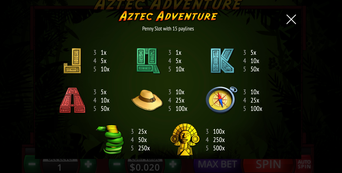 The way to win the highest 500 coin jackpot is to line up five of the Aztec Statues icons on the reels at the same time. If you happen to land for of these Aztec Statues, you will take home the 250-coin jackpot, plus gamblers can win the 250-coin jackpot if you line up five of the Serpent icons on the reels.